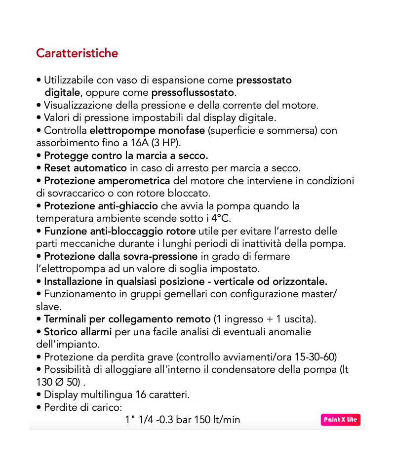 DISPOSITIVO DIGITALE PER IL CONTROLLO DI ELETTROPOMPE. AVVIA ED ARRESTA LA POMPA AUTOMATICAMENTE. CONFIGURABILE COME PRESSOSTATO DIGITALE DA IMPIEGARE CON UN VASO DI ESPANSIONE OPPURE COME CONTROLLORE DI PRESSIONE E FLUSSO. PROTEGGE LA POMPA DA ANOMALIE NELL’IMPIANTO (MANCANZA ACQUA, FORMAZIONE DI GHIACCIO, SOVRACCARICO DI CORRENTE, PRESSIONE ECCESSIVA, BLOCCAGGIO ROTORE, AVVIAMENTI CONTINUI).