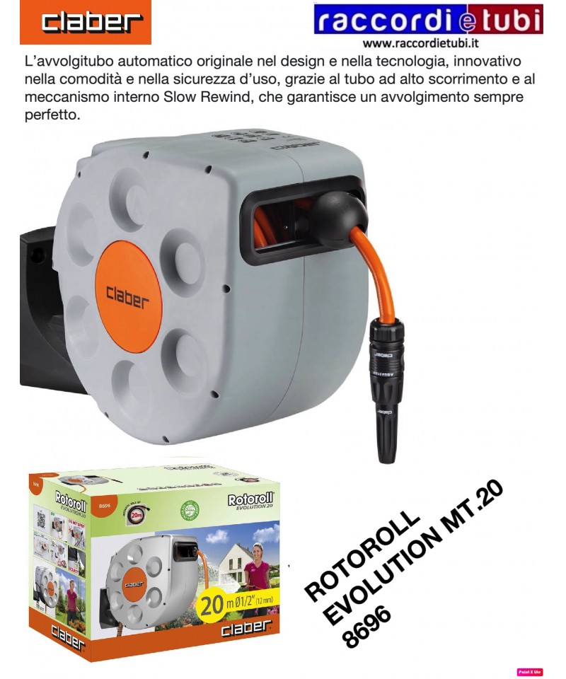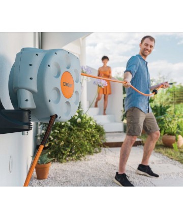 Avvolgitubo con riavvolgimento automatico, dotato di esclusivo meccanismo Slow Rewind per un utilizzo confortevole e sicuro. Pronto all’uso con 20 m di tubo speciale indeformabile con superficie anti-attrito per un avvolgimento rapido e perfetto. Costruito con materiali resistenti agli urti e ai raggi solari per garantire la massima durata nel tempo. Il supporto a muro in resina rinforzata, con perno in alluminio inossidabile, permette di orientare fino a 180° l’avvolgitubo nella direzione di utilizzo, evitando pieghe e strozzamenti del tubo. Dotato di prolunga per il collegamento al rubinetto (1,5 m), presa 3/4” (20-27 mm), raccordi automatici e lancia a spruzzo. Completo di supporto a muro, viti e tasselli per il montaggio a parete.