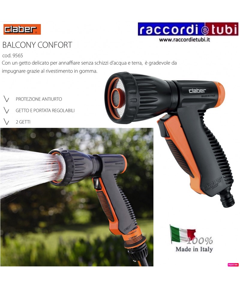 La lancia a pistola Claber Balcony Confort ha una morbida impugnatura anatomica in gomma, mentre la ghiera, anch'essa in gomma, è con funzione antiurto, apribile, ispezionabile ed anche pulibile. L'aratore di cui è dotata permette di ottenere un getto d'acqua soffice che va ad unirsi a bolle d'aria per garantire un irrigazione senza schizzo. Presenta un comodo meccanismo anteriore a pulsante per l'apertura e la chiusura del flusso dell'acqua. La manopola posteriore permette di regolare la portata dell'acqua. Dal design bello e funzionale, la sua impugnatura rivestita in gomma garantisce un grip comodo anche con le mani bagnate. Assicura ergonomia e praticità di utilizzo necessari per l'irrigazione su balconi e terrazzi. Dotata di un'uscita collegabile a qualsiasi raccordo automatico per tubo da irrigazione.