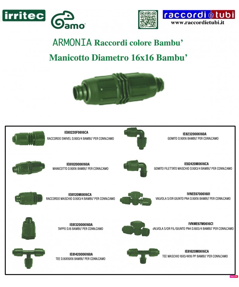 Raccorderia IRRITEC-CAMO diametro 16 per tubo PE bassa densita' e ala Gocciolante, Dedicata in particolamete per i suoi colori Noce e Bambu' NEW Progetto IRRITEC Camo