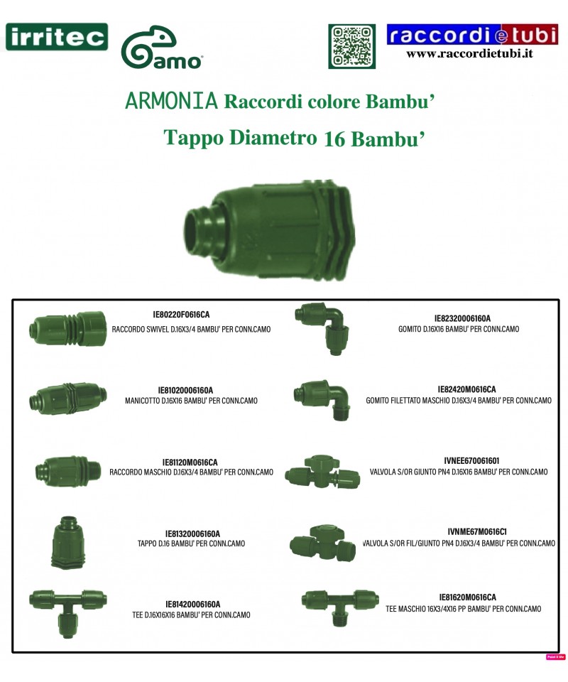 Raccorderia IRRITEC-CAMO diametro 16 per tubo PE bassa densita' e ala Gocciolante, Dedicata in particolamete per i suoi colori Noce e Bambu' NEW Progetto IRRITEC Camo