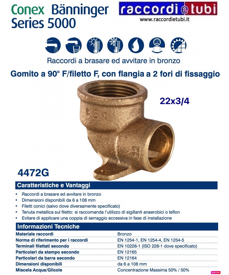 I raccordi della serie 5000 sono prodotti in accordo a UNI EN 1254-1, UNI EN 1254-4 e UNI EN 1254-5 e idonei alla realizzazione di giunzioni in accoppiamento con tubi di rame prodotti secondo UNI EN 1057, UNI EN 12735- 1 e UNI EN 12735-2 . Adatti all'impiego negli impianti di adduzione e distribuzione di acqua fredda e calda, di riscaldamento e raffrescamento, di gas combustibili e refrigeranti.