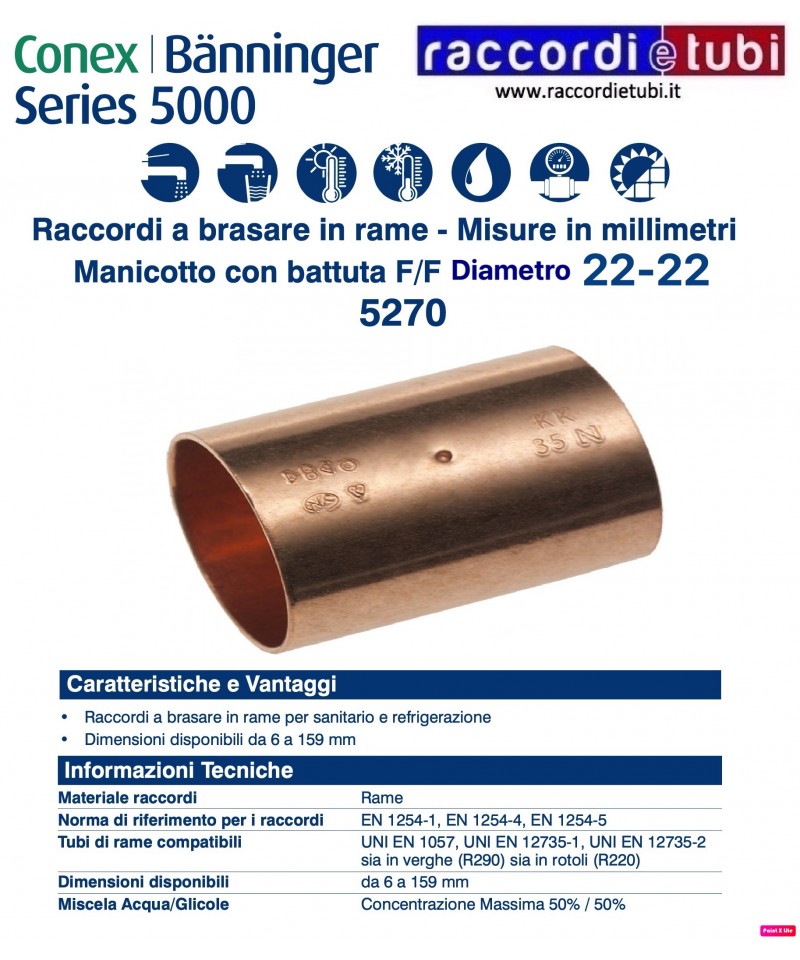 I raccordi della serie 5000 sono prodotti in accordo a UNI EN 1254-1, UNI EN 1254-4 e UNI EN 1254-5 e idonei alla realizzazione di giunzioni in accoppiamento con tubi di rame prodotti secondo UNI EN 1057, UNI EN 12735- 1 e UNI EN 12735-2 . Adatti all'impiego negli impianti di adduzione e distribuzione di acqua fredda e calda, di riscaldamento e raffrescamento, di gas combustibili e refrigeranti.