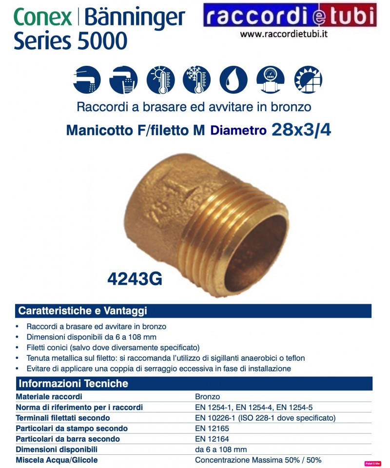 I raccordi della serie 5000 sono prodotti in accordo a UNI EN 1254-1, UNI EN 1254-4 e UNI EN 1254-5 e idonei alla realizzazione di giunzioni in accoppiamento con tubi di rame prodotti secondo UNI EN 1057, UNI EN 12735- 1 e UNI EN 12735-2 . Adatti all'impiego negli impianti di adduzione e distribuzione di acqua fredda e calda, di riscaldamento e raffrescamento, di gas combustibili e refrigeranti.