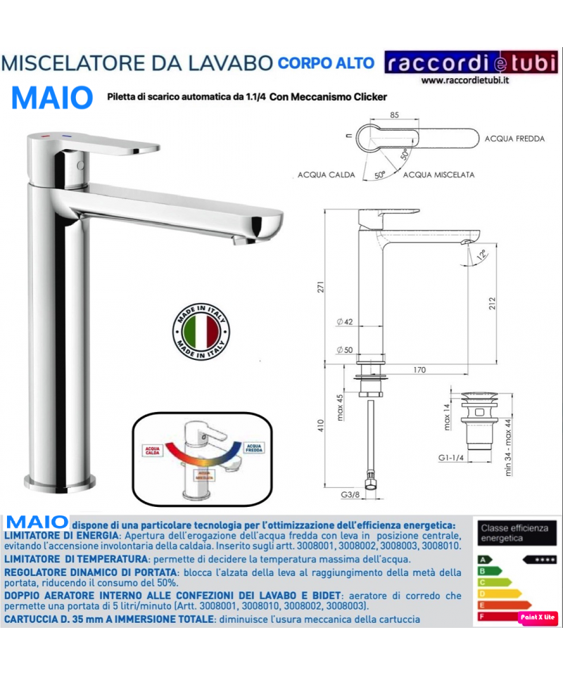 LIMITATORE DI ENERGIA: Apertura dell’erogazione dell’acqua fredda con leva in posizione centrale,