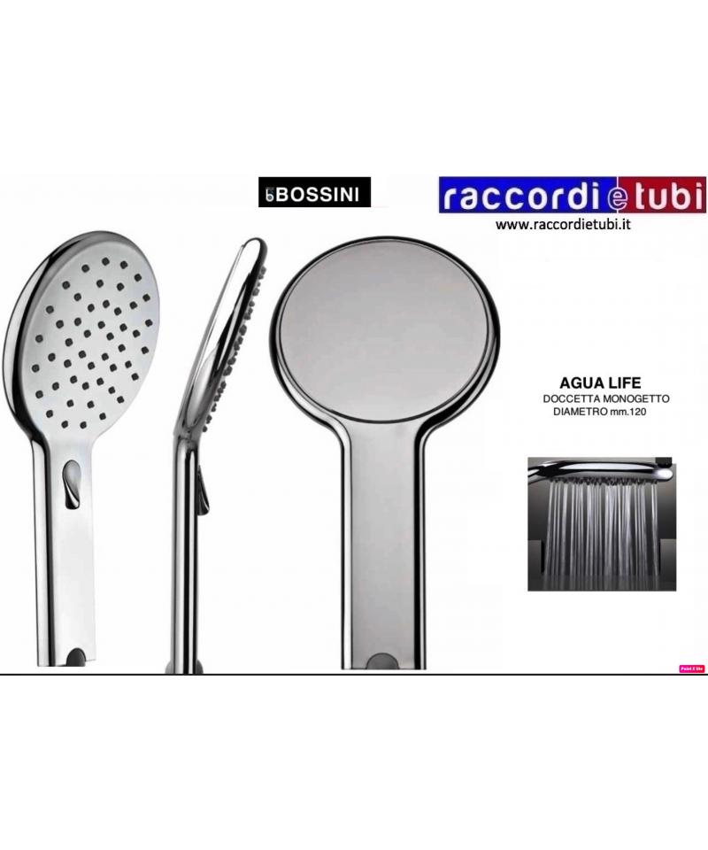 Agua Life (B00176) Doccia dal design superpiatto e diffusore dal diametro 120 mm, dotata di un dispositivo di regolazione del flusso d’acqua, mediante la levetta che consente di selezionare a piacere un vigoroso getto pioggia o un getto morbido e delicato che riduce il consumo dell’acqua fino a al 50%, pur garantendo il massimo comfort. indicata per uso residenziale. Doccia monogetto Ø 120 mm.