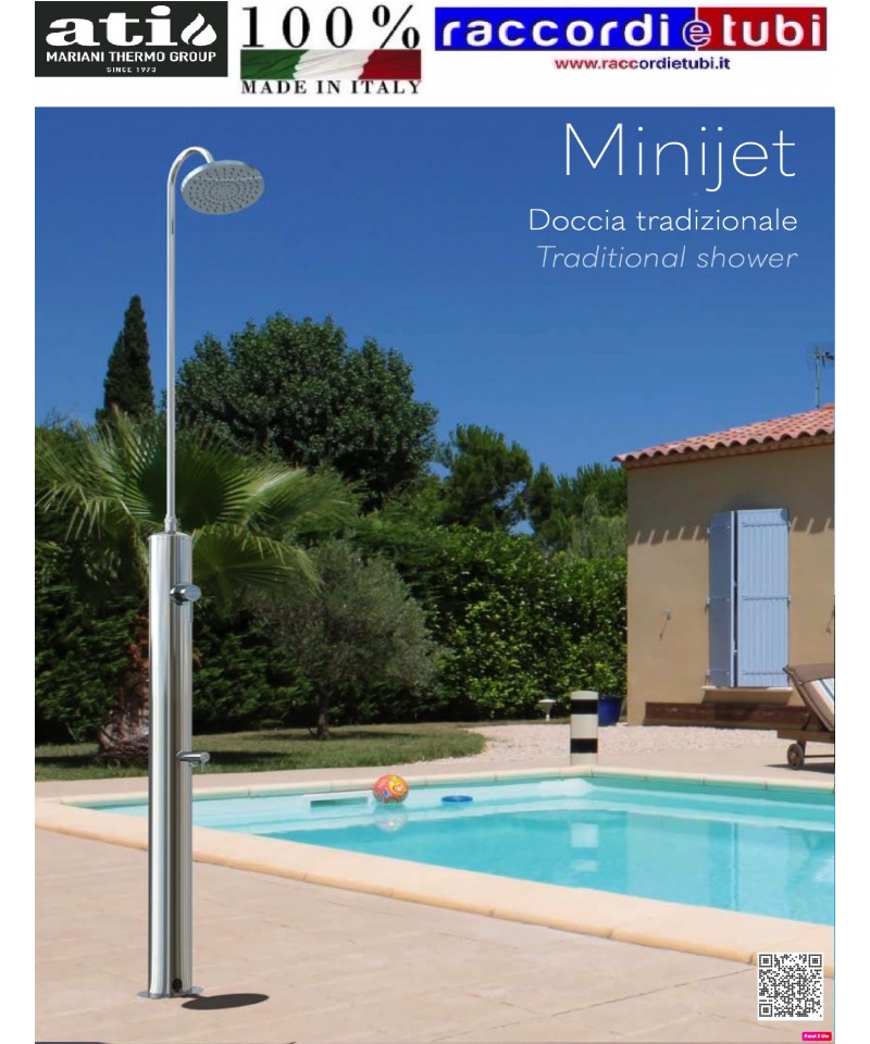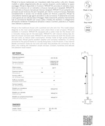 Minijet è la doccia tradizionale con miscelatore dalla linea pulita e ultra slim. Questo modello si adatta elegantemente alle più svariate situazioni, anche laddove lo spazio scarseggia. Minijet è disponibile in 3 versioni: MINIJET-M, provvista di rubinetto misce- latore per la doccia e di un rubinetto a chiusura manuale per il lavapiedi; MINIJET-R, con rubinetto a chiusura manuale per doccia e lavapiedi; MINIJET-P, con pulsante tem- porizzato sia per la doccia che per il lavapiedi, per ridurre i consumi di acqua. Realizzata completamente in acciaio inox di elevata qualità con finitura a specchio, Minijet ha un’eccellente resistenza agli agenti atmosferici e alla corrosione. È saldamente ancorata a terra grazie ad una robusta base di fissaggio. Nella versione M, presenta internamente tubi di connessione flessibili per acqua calda e fredda che facilitano il collegamento all’impianto rendendo l’installazione semplice e veloce. Comfort, praticità e un impatto visivo delicato e piacevole.