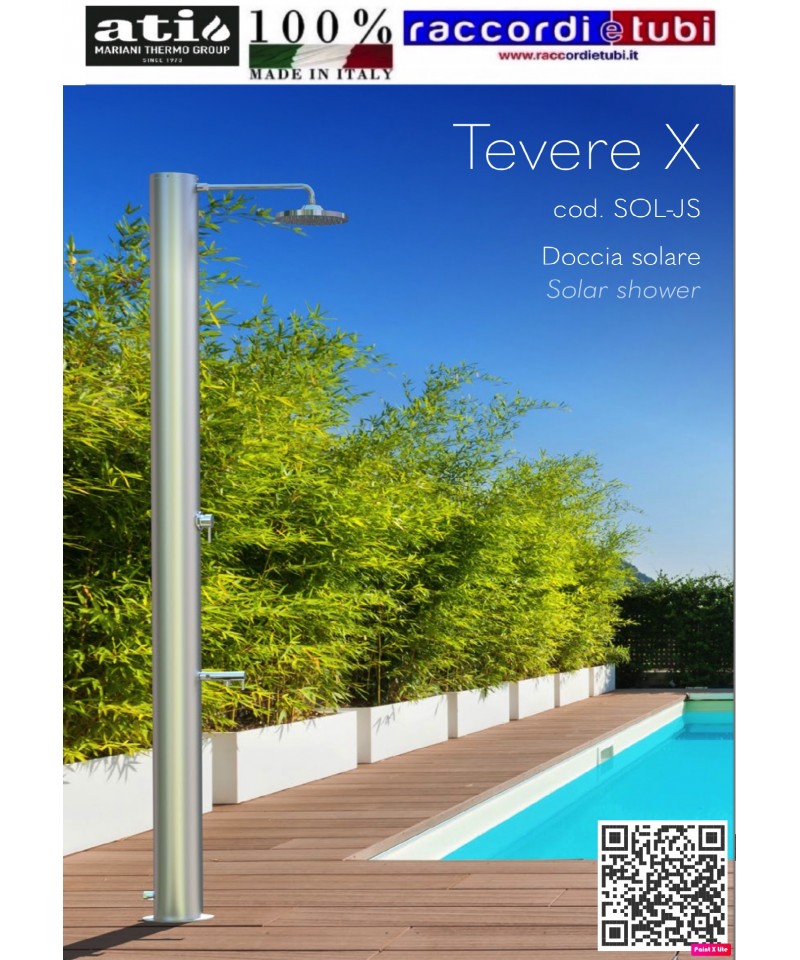 Tevere è indubbiamente il modello passe-partout della linea Gocce. Compatta, dal design minimalista, si adatta perfettamente a tutti gli ambienti e necessita di pochissi- mo spazio per l’installazione. Si compone di un tubo solare in acciaio inox con finitura satinata che rifinisce la superficie e rende Tevere ancora più resistente agli agenti atmo- sferici. Le parti idrauliche, realizzate in metallo nobile, sono opportunamente studiate e trattate per uso esterno. Tra queste, l’innovativo soffione con morbidi ugelli gommati che rendono semplicissima e veloce l’eliminazione del calcare, allungando sensibilmen- te il ciclo di vita del componente. Il soffione a risparmio energetico “eco rain”, grazie a particolari fessure situate nella griglia della doccia, miscela l’aria all’acqua, fornendo un getto potente ed efficace ed impiegando una minore quantità d’acqua. In una giornata soleggiata, Tevere regalerà fino al calar della sera il piacere dell’avvolgente tepore dell’ac- qua, riscaldata dai raggi solari