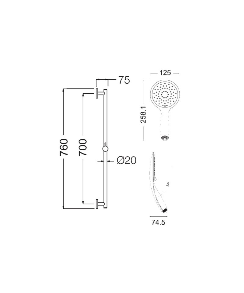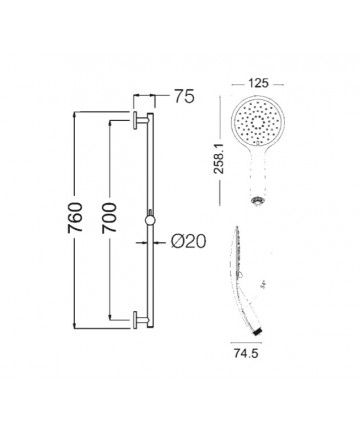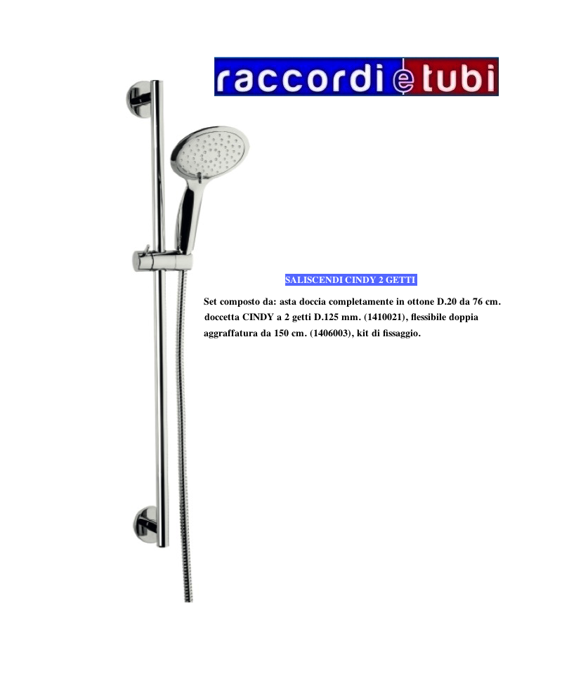 Set composto da: asta doccia completamente in ottone D.20 da 76 cm., doccetta CINDY a 2 getti D.125 mm. (1410021), fl essibile doppia aggraffatura da 150 cm. (1406003), kit di fi ssaggio.