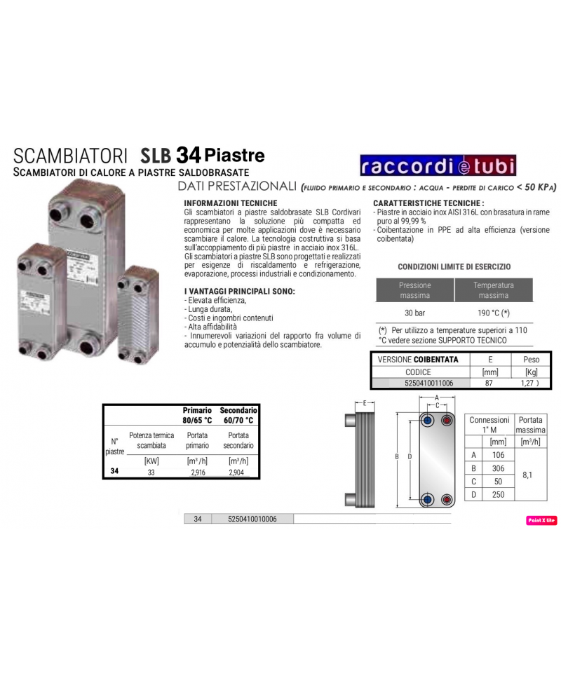 CARATTERISTICHE TECNICHE : - Piastre in acciaio inox AISI 316L con brasatura in rame puro al 99,99 % - Coibentazione in PPE ad alta efficienza (versione coibentata)