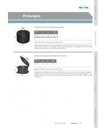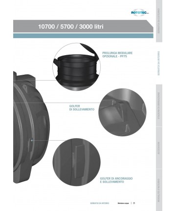 Materiale: serbatoi da esterno in monoblocco di polietilene lineare ad alta densità (LLDPE), dotati di tappo di ispezione a vite con sfiato e fori di scarico e svuotamento totale.