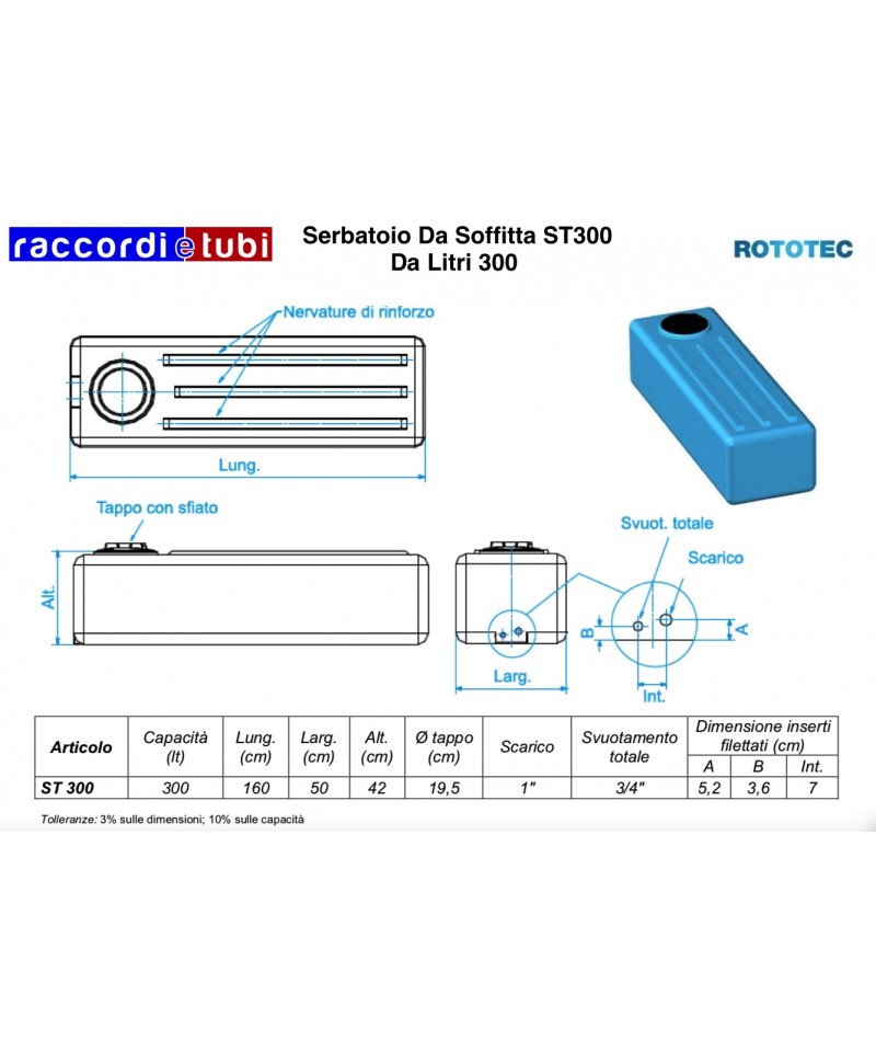 Materiale: serbatoi da esterno in monoblocco di polietilene lineare ad alta densità (LLDPE), dotati di tappo di ispezione a vite con sfiato e fori di scarico e svuotamento totale.