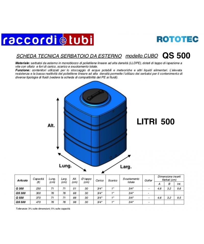 Materiale: contenitore da interro in monoblocco corrugato di polietilene lineare ad alta densità (LLDPE) liscio munito di tubazione di entrata in PVC con guarnizione in gomma N.B.R., elettropompa sommergibile per acque nere collegata a condotta in uscita in polietilene. La pompa è munita di galleggiante per marcia/arresto automatica.