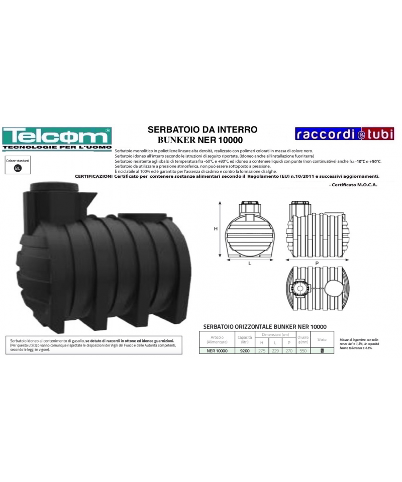 SCHEDA TECNICA SERBATOIO DA ESTERNO modello VERTICALE Materiale: serbatoi da esterno in monoblocco di polietilene lineare ad alta densità (LLDPE), dotati di tappo di ispezione a vite con sfiato e fori di scarico e svuotamento totale. Funzione: contenitori utilizzati per lo stoccaggio di acque potabili e meteoriche ed altri liquidi alimentari. L’elevata resistenza e la bassa reattività del polietilene lineare ad alta densità permette l’utilizzo dei serbatoi per il contenimento di diverse tipologie di fluidi (vedere la scheda di compatibilità del PE ai fluidi). Uso e manutenzione: le cisterne sopportano sbalzi di temperatura esterna da – 20 °C a 80 °C, non sono soggette a deterioramenti nel tempo ed i materiali utilizzati assicurano la massima affidabilità per quanto riguarda problemi di corrosione ed ossidazione. La struttura in monoblocco garantisce robustezza e solidità in quanto non sono presenti saldature che potrebbero indebolire le parti sollecitate da tensioni interne. Per esigenza di installazione è possibile praticare fori nei serbatoi sugli appositi piani. Le superfici lisce dei serbatoi consentono una facile manutenzione, la leggerezza un facile trasporto ed installazione. Inoltre il costo è nettamente inferiore al metallo, al cemento e alla vetroresina. Disponibilità colori: di serie: azzurro; su richiesta: verde, terracotta, grigio. Modularità: grazie all’installazione di giunti flangiati in PE è possibile collegare più serbatoi per ottenere elevati accumuli.