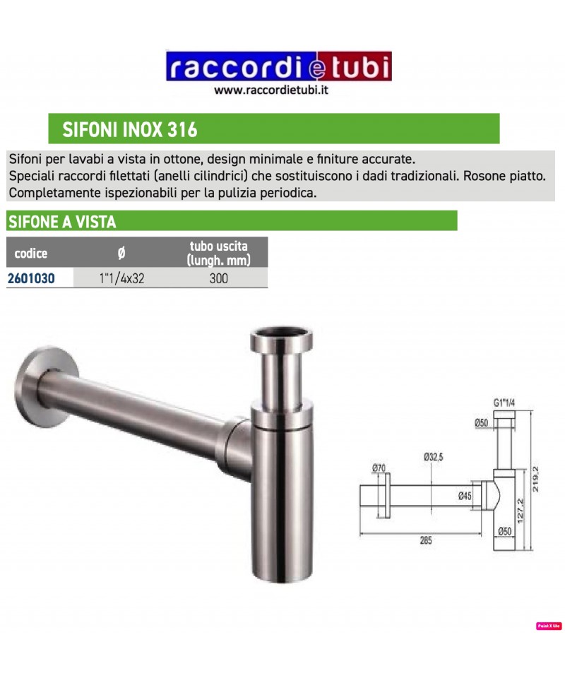 SIFONE A VISTA CILINDRICO DIAMETRO 11/4''x32mm IN ACCIAIO INOX 316