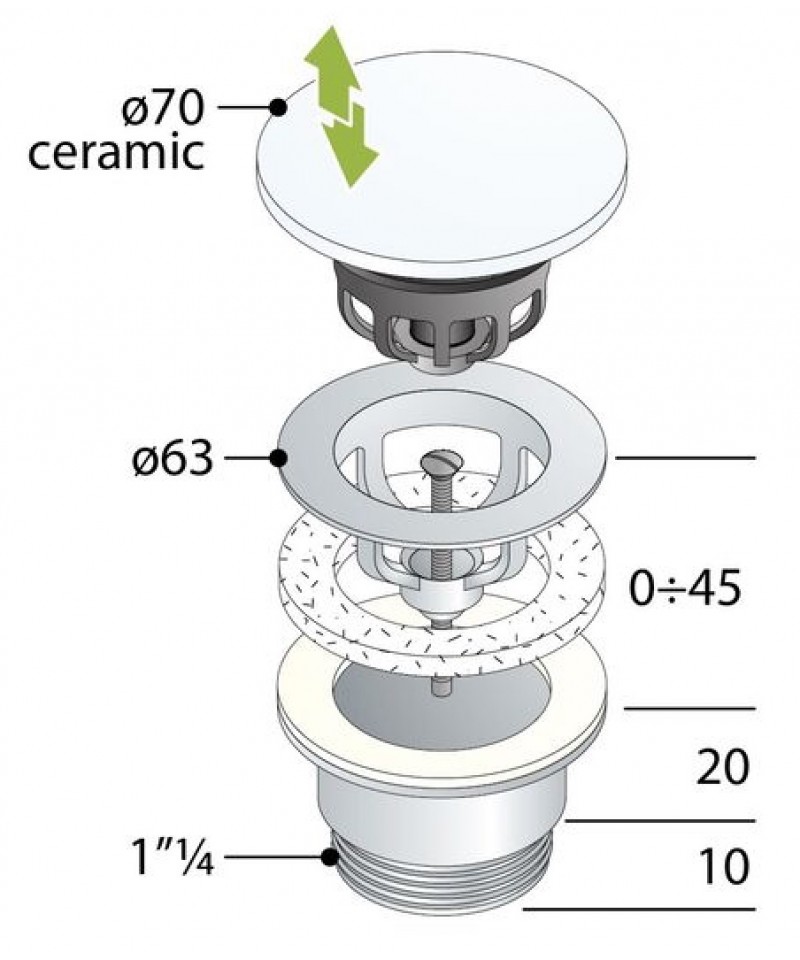 Meccanismo clicker, tappo coprente, vite passante per lavabi di spessore fino a 60 mm. Tappo ceramico D.70.