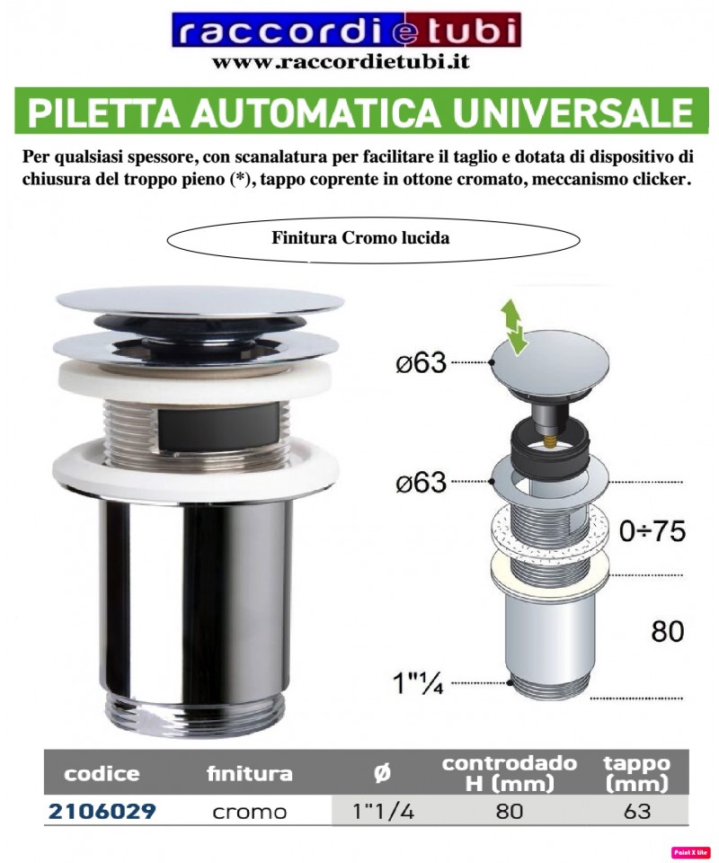 Per qualsiasi spessore, con scanalatura per facilitare il taglio e dotata di dispositivo di chiusura del troppo pieno (*), tappo coprente in ottone cromato, meccanismo clicker.