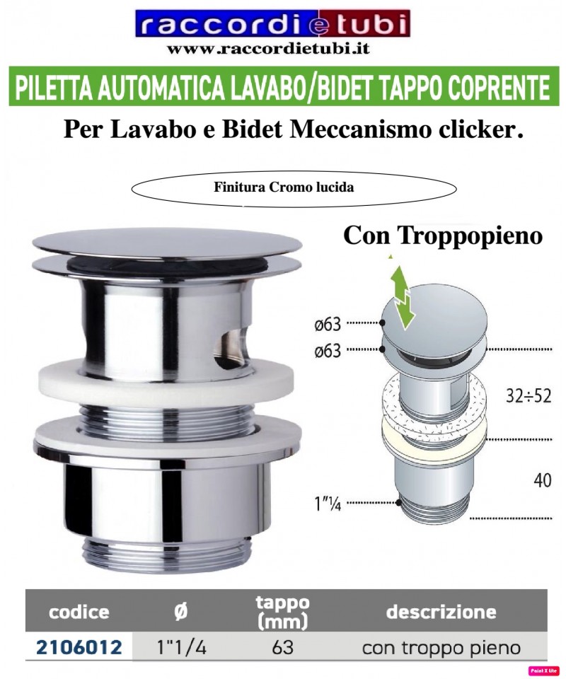 PILETTA AUTOMATICA lavabo-bidet 11/4''x63mm con troppopieno sistema Cliker