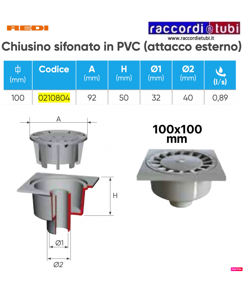 CHIUSINO SIFONATO IN PVC CM.10X10 REDI 0210804 COM ATTACCO 50 ESTERNO 32 INTERNO