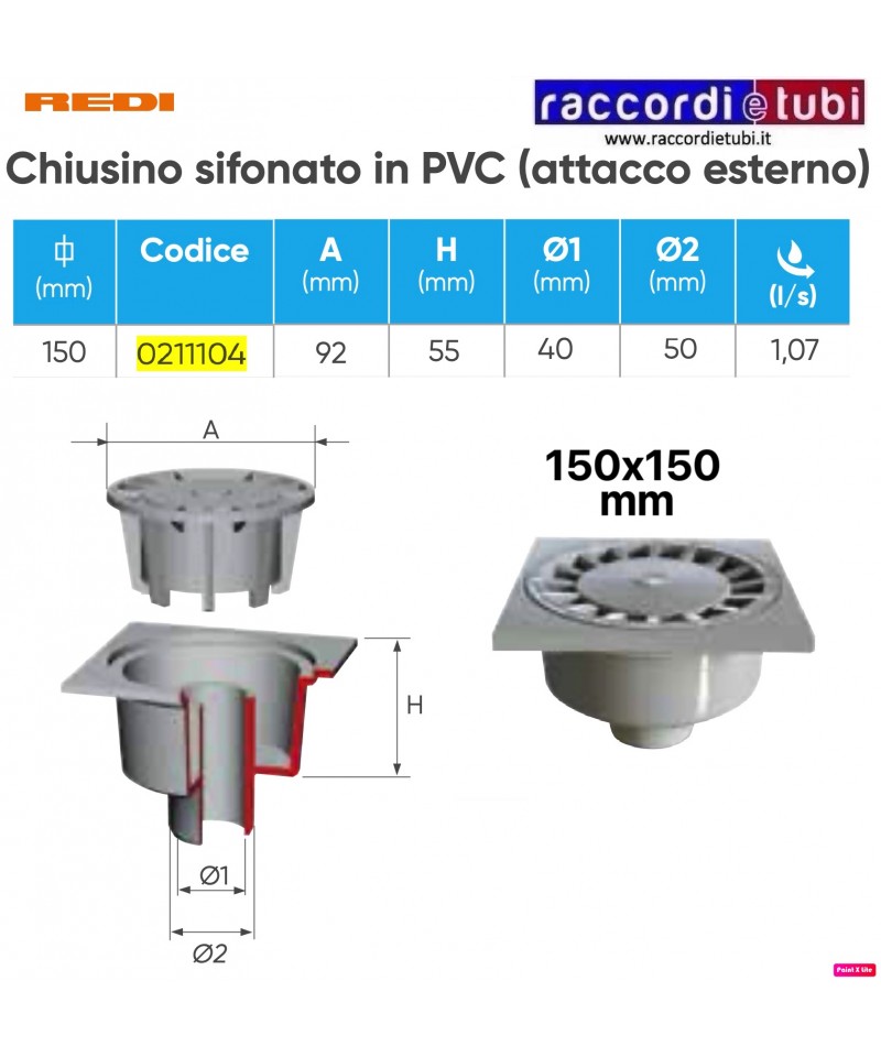 CHIUSINO SIFONATO IN PVC CM.10X10 REDI 0211104 CON ATTACCO 50 ESTERNO 40 INTERNO