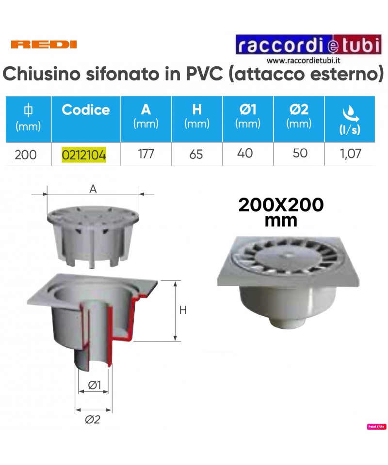 CHIUSINO SIFONATO IN PVC CM.20X20 REDI 0212104 COM ATTACCO 50 ESTERNO 40 INTERNO
