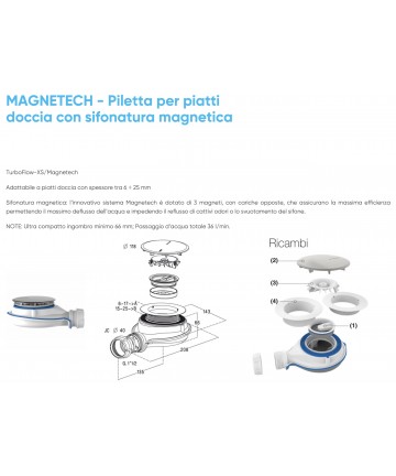 Sifonatura magnetica: l’innovativo sistema Magnetech è dotato di 3 magneti, con cariche opposte, che assicurano la massima efficienza permettendo il massimo deflusso dell’acqua e impedendo il reflusso di cattivi odori o lo svuotamento del sifone.