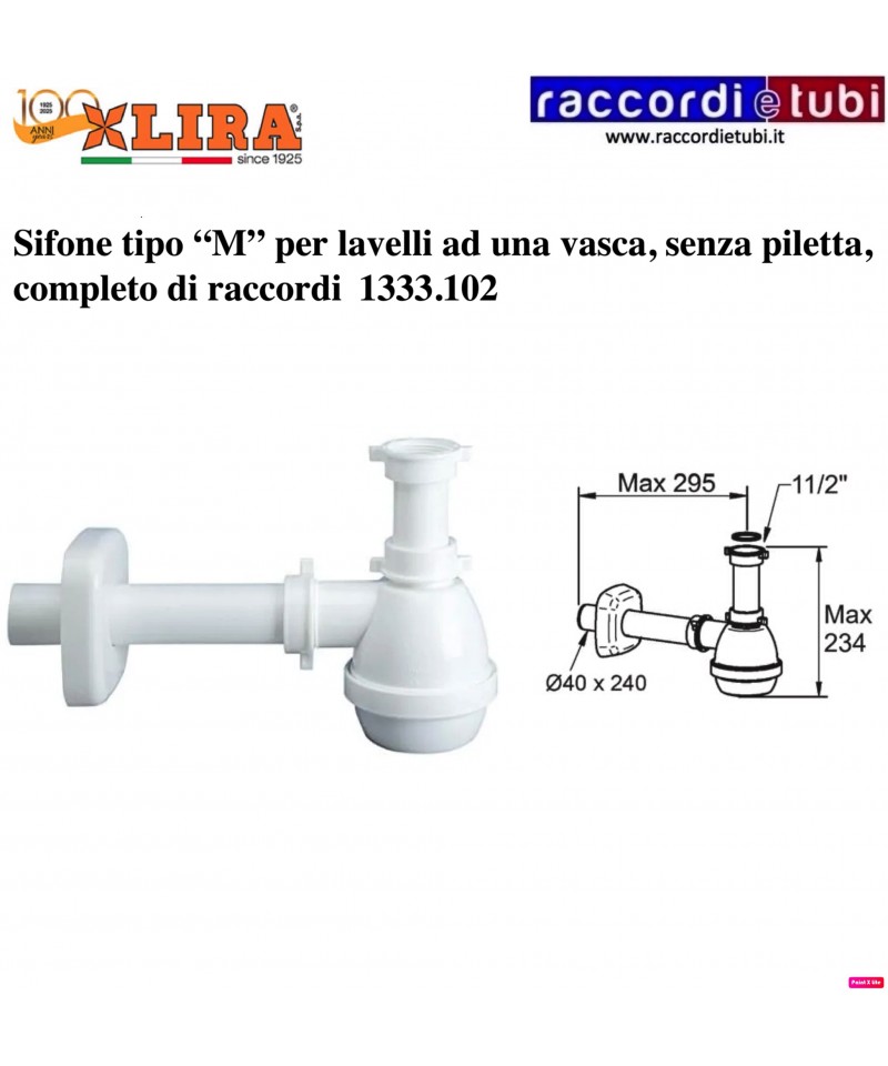 Sifone tipo “M” per lavelli ad una vasca, senza piletta, completo di raccordi