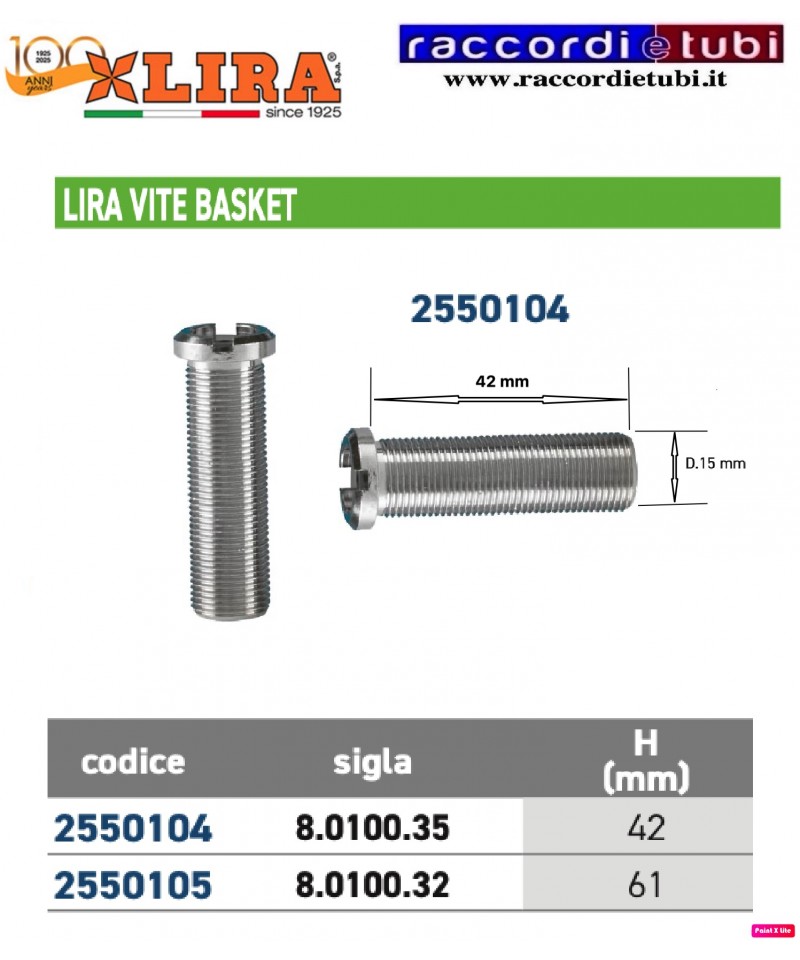 VITE DI PROLUNGA PER PILETTA LIRA TAGLIO MONETA ALTEZZA mm.42 DIAMETRO FILETTO mm.15