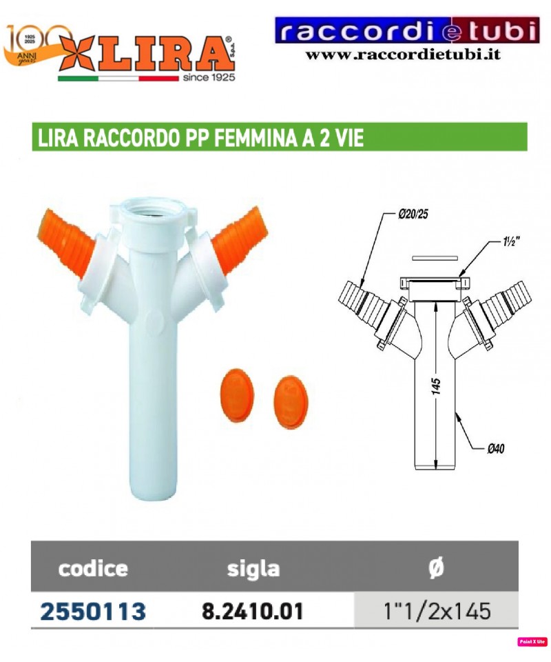 RACCORDO LIRA IN PP CON DOPPIO PORTAGOMMA FEMMINA GIREVOLE 1.1/2 PER TUBO DIAMETRO 40