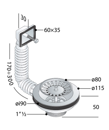PILETTA IN PP LAVELLI INOX FORO DIAMETRO 60,CONTROPPOPIENO,TAPPO E CATENELLA 1.1/2