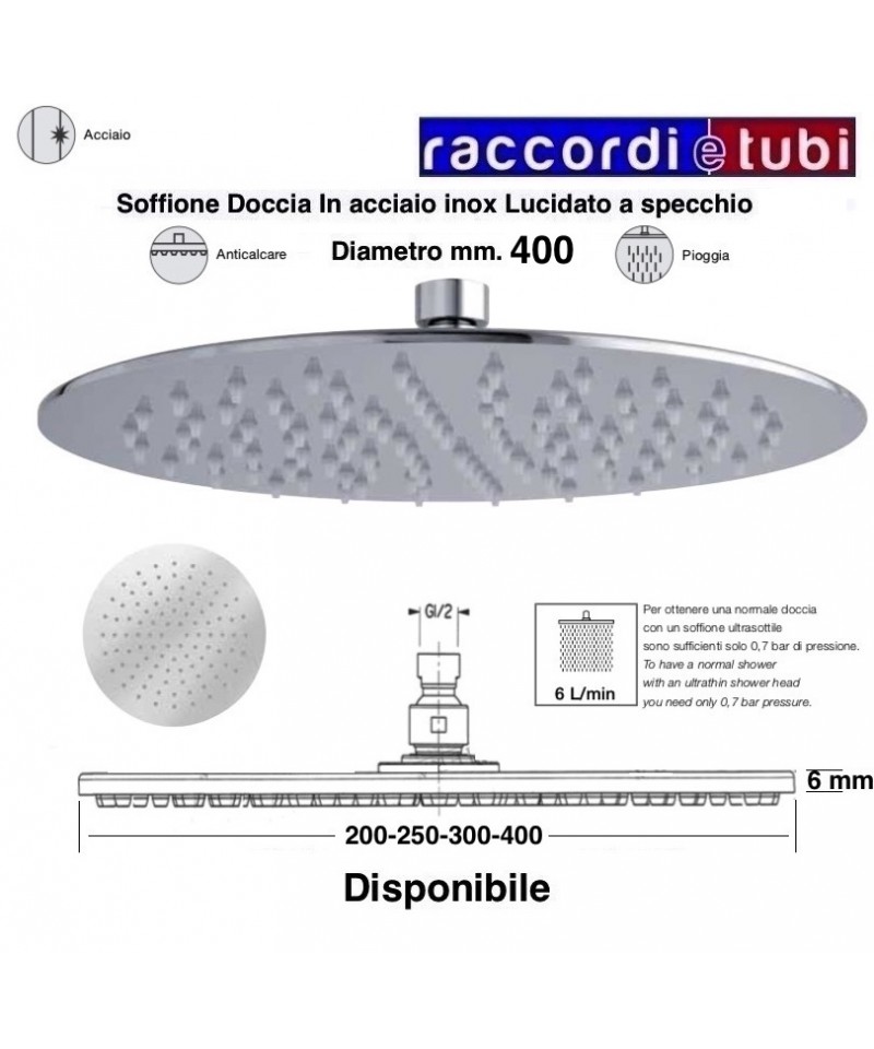 Soffione in acciaio inox lucido Spessore 6 mm getti in silicone soffice autopulente anticalcare "non ispezionabile"