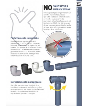 Sistema estremamente maneggevole e rapido da installare grazie alla giunzione ad innesto senza necessità di lubrificazione, con guarnizione elastomerica inserita direttamente nel bicchiere (funTEC technologie). Ciò impedisce qualsiasi possibilità di perdita della guarnizione nelle fasi di stoccaggio, trasporto o posa del materiale. Con il sistema POLO-KAL XS sino a 10 metri di colonna non è richiesto il consueto spazio nel bicchiere per la dilatazione. Il sistema in polipropilene POLO-KAL XS è compatibile alla connessione con altri materiali plastici in PP/PE-HD/PVC nei diametri standard.
