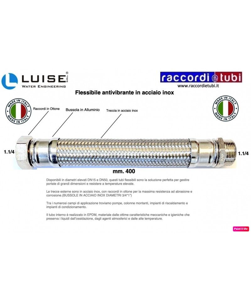 Antivibrante trecciatura in acciaio inox gomma EPDM con raccordi maschio femmina in ottone nichelato,portagomma interno in ottone bussole in acciaio inox AISI 304 (nei diametri 3/4 e 1")