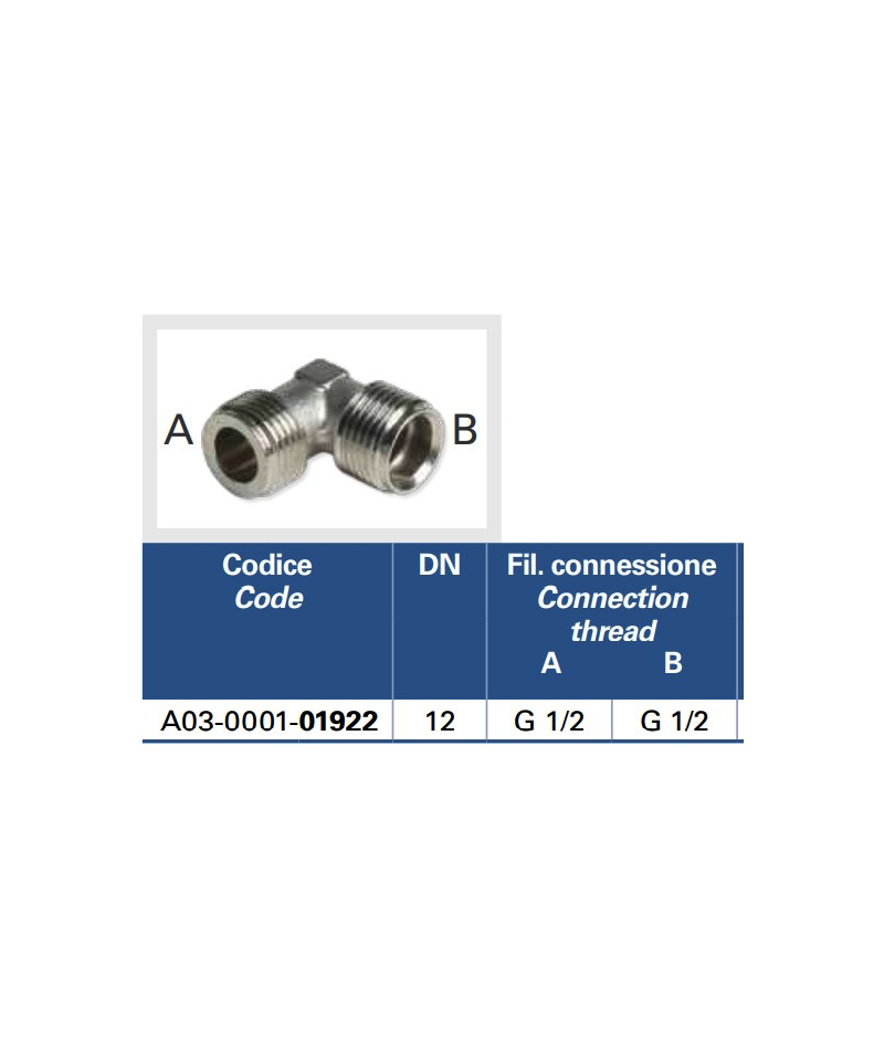 Gomito 90° M/M in ottone nichelato con flettatura maschio ISO 228 G a battuta piana (A) e flettatura maschio ISO 228 G con sede per tubo rame De 14 (B)