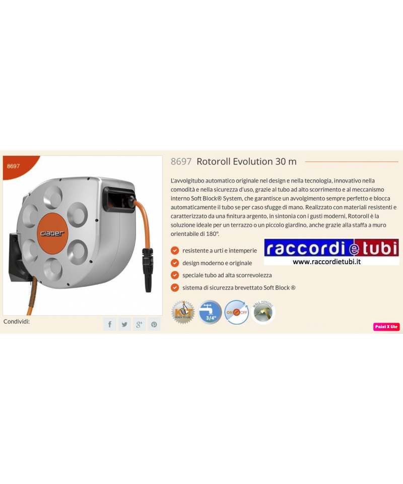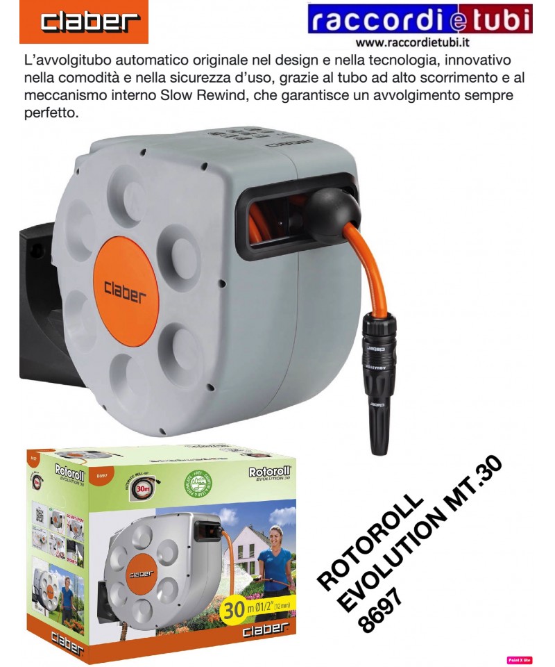 L'avvolgitubo automatico originale nel design e nella tecnologia, innovativo nella comodità e nella sicurezza d'uso, grazie al tubo ad alto scorrimento e al meccanismo interno Soft Block® System, che garantisce un avvolgimento sempre perfetto e blocca automaticamente il tubo se per caso sfugge di mano. Realizzato con materiali resistenti e caratterizzato da una finitura argento, in sintonia con i gusti moderni, Rotoroll è la soluzione ideale per un terrazzo o un piccolo giardino, anche grazie alla staffa a muro orientabile di 180°.Avvolgitubo con riavvolgimento automatico, dotato di esclusivo meccanismo Slow Rewind per un utilizzo confortevole e sicuro. Pronto all’uso con 20 m di tubo speciale indeformabile con superficie anti-attrito per un avvolgimento rapido e perfetto. Costruito con materiali resistenti agli urti e ai raggi solari per garantire la massima durata nel tempo. Il supporto a muro in resina rinforzata, con perno in alluminio inossidabile, permette di orientare fino a 180° l’avvolgitubo nella direzione di utilizzo, evitando pieghe e strozzamenti del tubo. Dotato di prolunga per il collegamento al rubinetto (1,5 m), presa 3/4” (20 - 27 mm) per il collegamento al rubinetto, raccordi automatici e lancia a spruzzo. Completo di supporto a muro, viti e tasselli per il montaggio a parete.