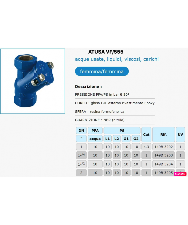 Valvola di ritegno a sfera con attacco filettato per drenaggio acque reflue. Filettatura interna 1.1/4 Installazione verticale. La pressione di esercizio va da 0.3 a 10 bar. Intervallo di temperatura del liquido da -10 a 80 gradi centigradi.